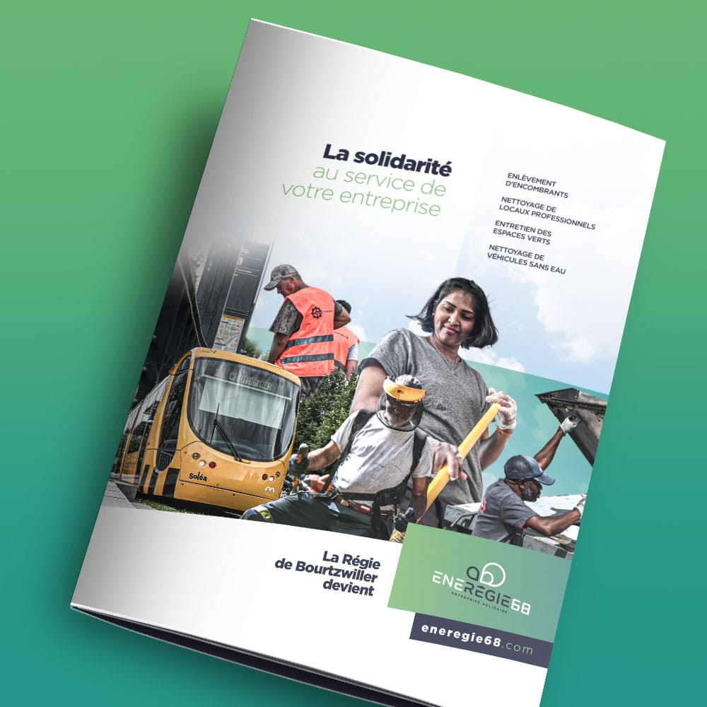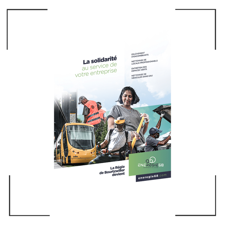 Pour Énergie68 (anciennement Régie de Bourtzwiller), nous avons conçu une brochure 3 volets destinés à présenter leurs services et à renforcer leur nouvelle identité auprès de leurs publics. Cette brochure, à la fois esthétique et fonctionnelle, avait pour mais de refléter leur transition stratégique tout en mettant en avant leurs offres et leurs valeurs.