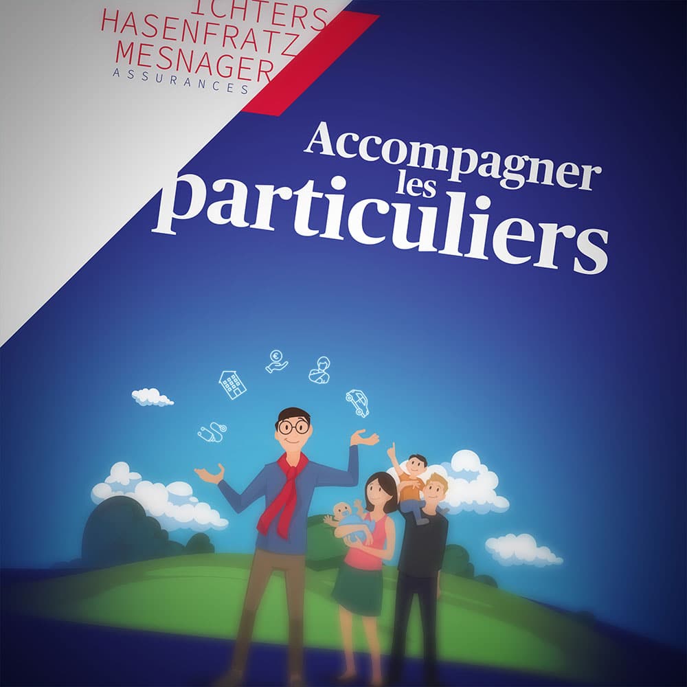 La mise en page, soignée et aérée, accompagne ce ton humain, avec une pensée hiérarchique visuelle pour faciliter la lecture. Les illustrations, associées à une palette de couleurs harmonieuses et apaisantes, reflètent les valeurs d’écoute et de confiance d’AXA Ichters Hasenfratz Mesnager.