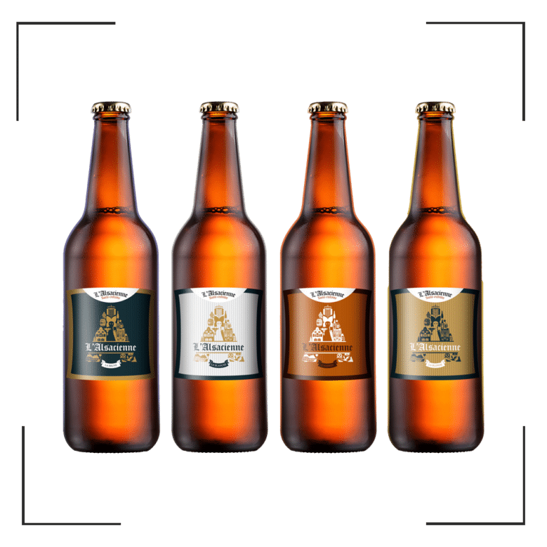 Nous avons eu l’occasion de réaliser des labels pour la brasserie « l’Alsacienne sans culotte », dont une bière IPA ou une bière au miel. Nous avons également travaillé sur une gamme prestige dédiée à la restauration et comprenant 4 déclinaisons : blonde, blanche, ambrée et brune.